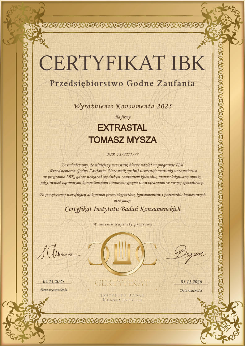 Działamy od 2016 roku. Gwarantujemy Ci fachową obsługę potwierdzoną wieloletnim doświadczeniem i tysiącami zrealizowanych zamówień. Nasze produkty Firmy EXTRASTAL wykonane są z materiałów najwyższej jakości. Wszystko to po to, aby jak najpełniej zaspokoić coraz bardziej wyrafinowane i często trudne w realizacji życzenia dzisiejszego klienta. W ostatnim czasie duży nacisk kładziemy na produkcję garaży drewnopodobnych w kolorach złoty dąb oraz orzech.Po każdym zamówieniu przesyłamy wizualizacje 3D wraz z specyfikacją.